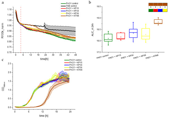 (a) Planktonic growth dynamic measured by the R100k_norm parameter for P. aeruginosa PAO1. The positive control consisted of untreated culture (green curve), negative control of TSA medium (black curve), and test samples of treated with phages at VBR = 1 with specific Pseudomonas phage KTN6 (brown curve), and Klebsiella phages KP15 (red curve), KP34 (blue curve), KP36 (yellow curve). (b) Box chart of the variability of the R100k_norm parameter for the area under the curves estimated for the range from 4 to 24 h of the experiment. The boxes present the statistical significance analysis with the colors corresponding to the panel (a). The asterisk indicates a significance level of p > 0.05; (c) OD600 measurement of planktonic PAO1 in the presence of phages (VBR = 1).