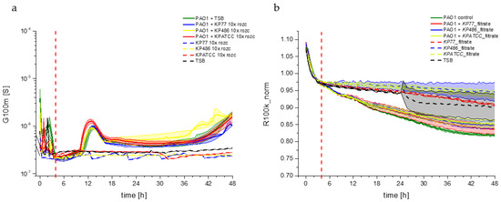 The high-frequency resistance (R100k_norm) of P. aeruginosa PAO1 cells incubated with K. pneumoniae culture filtrates showed the same change dynamics as the control culture of PAO1, thus confirming no effect on the growth dynamics of planktonic forms of P. aeruginosa PAO1 (Figure 5b). The negative control consisting of the filtrates alone (without P. aeruginosa PAO1 cells in the measurement wells) excluded any influence of the filtrates on the R100k_norm parameter during the 48 h experiment, as the blank curves closely resembled the TSA medium curve. In summary, these results proved that K. pneumoniae culture components released during cell lysis did not affect the biofilm formation kinetics and the planktonic population of P. aeruginosa PAO1. Therefore, the observed acceleration of PAO1 biofilm formation was attributable to the presence of the non-specific Klebsiella phage rather than any residual components from the bacterial host filtrates.
