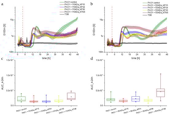 (a) Biofilm growth dynamics after application of 10 kDa fraction of phage lysates KP15 (red curve), KP34 (blue curve), KP36 (yellow curve) KTN6 (brown curve) to P. aeruginosa PAO1 (green curve) culture measured by impedance the G100m parameter. (b) Impedance measurement with detection of the G100m parameter of PAO1 cultures with phage lysates KP15 (red curve), KP34 (blue curve), KP36 (yellow curve) KTN6 (brown curve) fractionated with a 30 kDa membrane. Statistical calculations for the tested 10 kDa and 30 kDa filtrate options significance level of p > 0.05 ((c,d), respectively).
