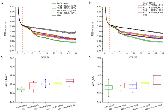 The growth dynamics of planktonic forms, measured using the R100k_norm parameter after the application of the 10 kDa and 30 kDa fractions of the tested lysates, show quite analogous behavior. Regardless of the fraction used, a quite clear decrease in the R100k_norm parameter compared to the TSB control was observed between the 4th and 12th hour of culture (Figure 7). In the following hours of the experiment, a slow decrease was recorded, with flattening of the curves for all options and reaching a value of about 0.85. The dynamics during the first 12 h were similar across all conditions, indicating no significant influence (stimulation or inhibition) of the phage lysate fractions on PAO1 cell division. After 12 h, the PAO1 control (green curve in Figure 7a,b) slightly diverged from the others. However, the difference in these dynamics was not significant, as indicated by statistical analyses.