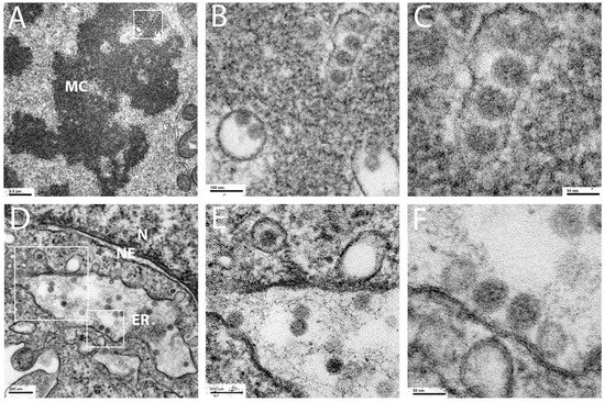TEM micrographs of HPV16 PsV-infected HeLa cells. Cells were infected for 24 h with HPV16 PsV and processed for TEM imaging. A mitotic cell is shown in panels (A–C), with the condensed mitotic chromatin labeled MC. The panel inset box in A shows the area enlarged in the following panels. An interphase cell is shown in panels (D–F). The nucleus (N), nuclear envelope (NE), and endoplasmic reticulum (ER) are labeled accordingly. Two regions indicated in panel (D) are enlarged in the following two panels. Size bars are shown within each panel.
