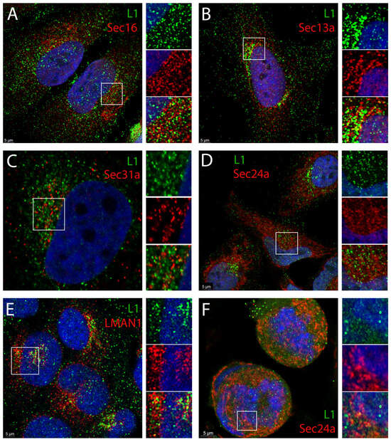 Sec16 is the defining protein of ER exit sites (ERES), where secretory cargo accumulates prior to anterograde transport [36,37]. This protein serves as the essential scaffold for the assembly of COPII vesicles around cargo [38]. We found clear colocalization of a subset of L1 (green) with Sec16 (red) as shown in Figure 2A. Split channels of the boxed area are shown on the right of the merged image. We also examined the localization of L1 relative to that of COPII vesicle components. COPII vesicle coats are comprise four cytosolic proteins that assemble into two concentric rings around their cargo (reviewed in [39]). The outer coat proteins, Sec13 and Sec31, encircle the inner coat protein complex Sec 23/24. The localization of L1 relative to Sec13a (red) is shown in Figure 2B. Again, the split channels of the selected region are shown on the right. Sec31a and anti-L1 staining is shown in Figure 2C, and L1 staining relative to Sec24a is shown in Figure 2D. The ER-Golgi intermediate compartment (ERGIC) is the recipient organelle of anterograde cargo from the ERES (reviewed in [40,41]). We examined the localization of L1 relative to LMAN1 (also known as ERGIC53), the characteristic marker protein of the ERGIC [42,43]. This staining is shown in Figure 2E. Thus, L1 colocalizes with both outer and inner COPII proteins within the ERES and likely traffics out of the ERES to the ERGIC. We did not expect more extensive colocalization than what is demonstrated as HPV PsV trafficking is asynchronous and would also be distributed throughout the retrograde pathway.