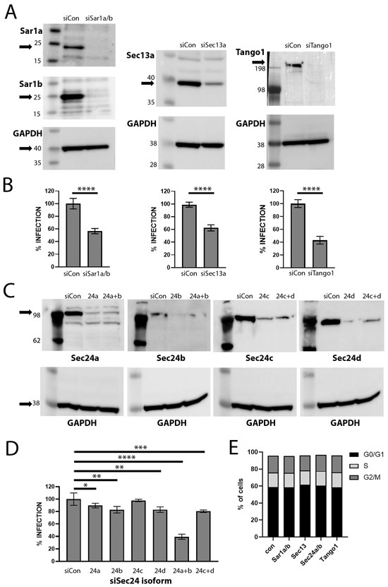 Silencing of COPII transport mediators affects HPV PsV infection. HeLa cells in 6-well dishes were transfected with the indicated siRNAs. At 48 h post transfection, cells were trypsinized and replated for PsV infection and Western blot analysis. Cells were lysed for Western blots at 72 h post siRNA transfection. Infection was evaluated at 48 h post virus addition, corresponding to 96 h post siRNA transfection. Panel (A) shows the protein expression for the indicated proteins under the conditions indicated above each lane. GAPDH was included as a loading standard and is shown in the lower panel in each instance. The expected protein migration is indicated by an arrow. The PsV infectivity, as determined by flow cytometry as percentage of GFP positive cells, is shown in panel (B). These results represent the compilation of multiple independent experiments. Additionally, each experiment was performed in triplicate. Sar1a/b depletion is the composite of nine experiments. The depletion of Sec13a was also replicated nine times. Tango1 depletion was performed in 12 separate experiments. Statistical significance < 0.0001 was reached in each instance (indicated by ****). Panel (C) shows the protein expression for the individual and combined siRNA transfection experiment for the Sec24 isoforms, as indicated. Panel (D) shows the infectivity analyses for these depletions. The only condition that was highly significant was the co-depletion of Sec24a and 24b isoforms (p-value < 0.0001 ****). The co-depletion of Sec24c and 24d reached a p-value of 0.0004 (***). Significance for the single isoform depletions are as follows: Sec24a, 0.0192, (*); Sec24b, 0.0020 (**); Sec24c, ns; Sec24d, 0.0018 (**). Panel (E) shows the cell cycle distribution of these populations at the time of the collection of the GFP flow cytometric data.