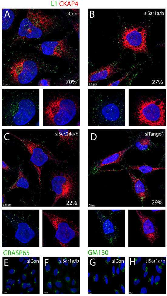 Perinuclear distribution of PsV under conditions of COPII silencing. At 48 h post siRNA transfection, cells were trypsinized and replated onto glass coverslips in a 24-well vessel. The perinuclear distribution of L1, relative to the ER sheet protein, CKAP4, was determined under each condition as noted in the panels (A–D). An enlarged split channel image of the indicated area is shown below each larger panel. The percentage of cells (from >50 cells) that showed a distinct perinuclear distribution of L1 is shown in each panel. In each instance, L1 is displayed in the green channel and CKAP4 is in the red channel. Nuclei are stained with DAPI (blue channel) in all panels. The effect of Sar1a/b silencing on the distribution of two Golgi markers is shown in panels (E–H) as indicated. The percentage of L1 staining determined to be perinuclear is indicated in each panel.