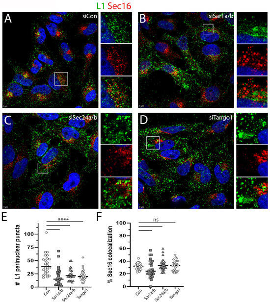 The observed L1 distribution pattern under COPII depletion conditions shown in Figure 4 did not resemble an ERES pattern, but we wanted to determine if these peripheral vesicles contained ERES markers. This staining is shown in Figure 5, with anti-L1 staining shown in the green channel and anti-Sec16 shown in the red channel. As expected, the siRNA transfected control cells showed good perinuclear distribution of L1 with a subset that colocalized with Sec16 (Figure 5A). A split channel image is shown below. As shown in Figure 4, the distribution of L1 under all the COPII-depletion conditions is dramatically altered. The depletion of Sar1a/b is shown in Figure 5B. The depletion of Sec24 a/b is shown in Figure 5C,D, illustrating an example of TANGO1 depletion. In each instance, a magnified and split channel image is shown in an adjacent panel. Interestingly, we found significantly fewer perinuclear L1 puncta under all depletion conditions as quantified in Figure 5E, but the colocalization of L1 and Sec16 within the remaining perinuclear population was unchanged across the conditions (Figure 5F). The more peripheral staining colocalizes minimally with Sec16. As the silencing did not completely ablate infection as shown in Figure 3, this phenotypic subset is unsurprising. These data further illustrate the aberrant PsV trafficking phenotype under conditions of COPII inactivation and also demonstrates that this pattern does not represent distal ERES elements. A priori, we would have anticipated the retention of PsV within the ER/ERES as a depletion of COPII elements should prevent their exodus. However, this locale is also occupied by the omegasome, a site of phagophore generation [50,51].