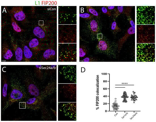 There exists a well-described interplay between anterograde COPII vesicle generation and autophagosome biogenesis [51]. Omegasome formation requires both the UNC-51-like kinase (ULK) complex and its scaffold protein FIP200 (also known as RB1CC1) [52,53]. FIP200 localizes to the isolation membrane, and recent studies have suggested that under conditions of cell stress, a remodeling of the endomembrane system occurs, which results in an enrichment of FIP200 in the ERES/ERGIC region [54]. Therefore, we wondered if, in the absence of COPII trafficking, the PsV was being shunted into this physically opposed pathway. We found that a subset of perinuclear L1 colocalized with FIP200 even under normal infection conditions (Figure 6A). This is unsurprising given the described localization of FIP200 to ERES membranes [55]. The distal L1-containing vesicles under this condition are largely free of FIP200 staining (Figure 6D). Most importantly the peripheral PsV staining found under conditions of COPII interference was found to be largely coincident with FIP200 staining. This is shown in Figure 6B,C for siRNA depletion of Sar1a/b and Sec24a/b, respectively. The degree of L1 and FIP200 colocalization in peripheral vesicles is quantified in Figure 6D. This quantification was determined across 30–40 distal regions of 23–32 cells/condition.