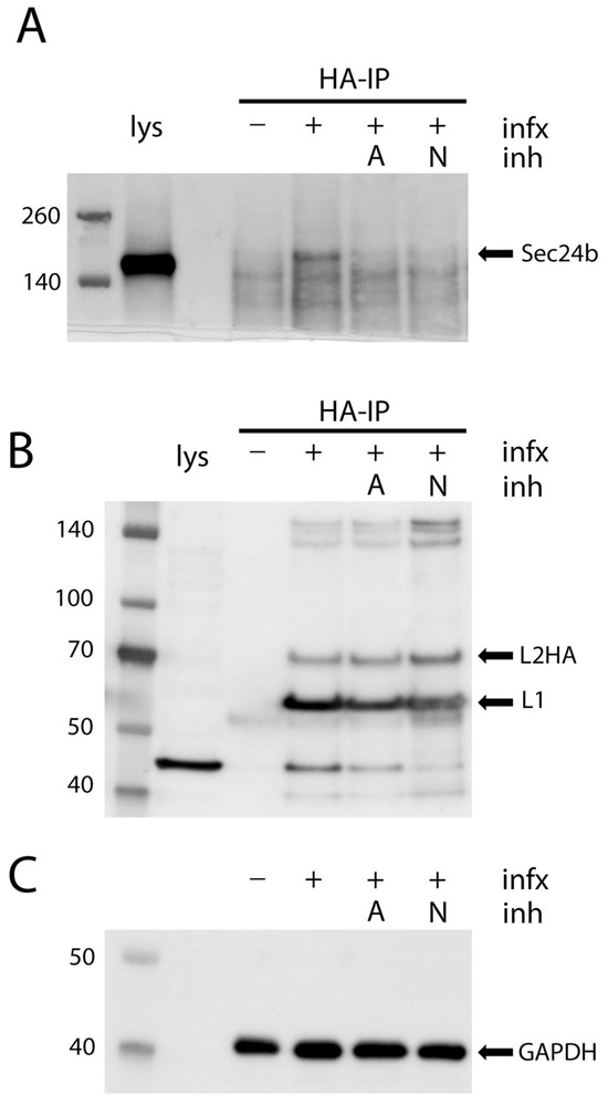 Isolation of Sec24b with HPV16 PsV. HeLa cells were infected with HPV16 PsV composed of L1 and an L2 containing five carboxyl terminal HA epitope tags (p16Ll2-laugh). At 6 h post infection some cells were treated with aphidicolin to a final concentration of 5 μg/mL. Another group was treated with NH4Cl to a final concentration of 20 mM and a third group was left untreated. Infection was allowed to continue for an additional 18 h. At this point the cells were crosslinked with DSP as detailed in the Materials and Methods. Protein complexes were immunoprecipitated from cell lysates with an anti-HA reagent and protein content determined by Western blotting. Panel (A) shows the detection of Sec24b of the various treatment conditions as indicated, +/− infection as denoted with “infx”. Lys denotes cell lysate included as a protein migration/detection control for Sec24b, indicated with an arrow. Inhibitor-treated samples are indicated with “inh”, while aphidicolin-treated samples are indicated by “A” and NH4Cl-treated samples indicated by “N”. The retained association of L1 with L2-HA is demonstrated in panel (B). Lane 1 shows HeLa cell lysate that was not subjected to immuno-isolation. The well-described lower molecular cross-reactive cellular protein is evident. The migration of L2-HA and L1 are indicated by arrows. GAPDH detection of the cell extracts used for the immunoprecipitation are shown in panel (C).