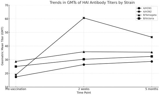 The trends in GMTs for each influenza strain across the three time points: pre-vaccination, 2 weeks post-vaccination, and 5 months post-vaccination. This graphical representation enhances the interpretation of the humoral immune response over time.