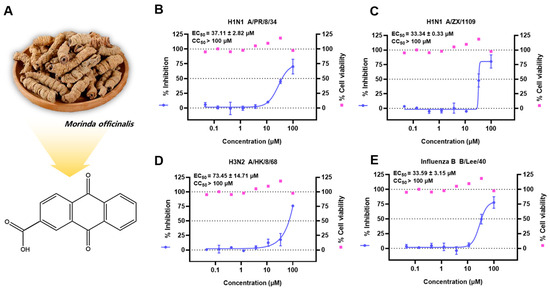 In vitro antiviral activities of A2CA derived from Morinda officinalis against multiple influenza virus strains. (A) A2CA from Morinda officinalis. (B–E) The protective effects of A2CA against four influenza virus strains were evaluated in MDCK cell lines using a CPE-based antiviral assay.