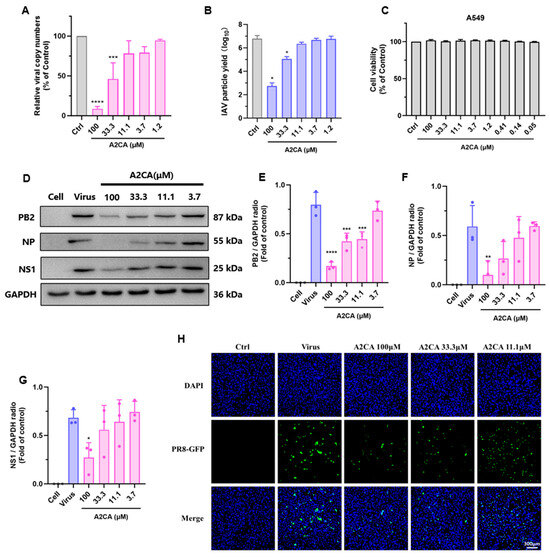 In brief, we seeded 1 × 104 cells A549 cells (in 100 μL) into each well in a black 96-well plate overnight. The cells were rinsed 2 times with PBS prior to inoculation with the H1N1 PR/8 reporter virus at a 0.1 MOI in a virus growth medium. Then, the series concentration of A2CA was added. At 2 hpi, the cells were rinsed 2 times, and the corresponding A2CA was re-added. After 16 h, a Leica DMi8 inverted microscope was employed to capture the images. The Hoechst 33342 channel was for used nuclear visualization, whereas the GFP channel was used for virus visualization [16].