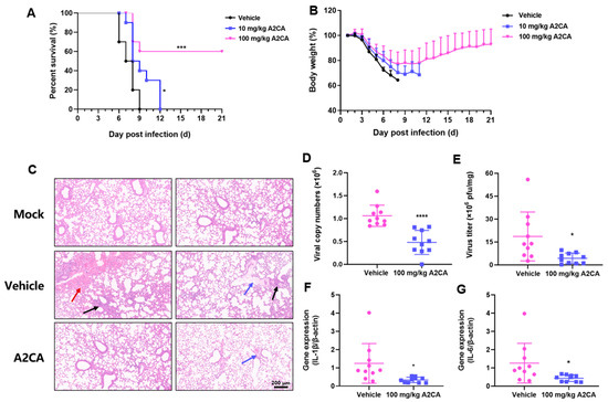 Considering the antiviral effect of A2CA in vitro, we next assessed the antiviral performance of A2CA in a lethal infection animal model. As shown in Figure 3A,B, all vehicle-treated mice rapidly lost weight and died within 6 to 9 days post infection (dpi), while a 100 mg/kg A2CA treatment for five consecutive days caused relatively small weight reduction at the beginning and facilitated a progressive restoration of body weight. Notably, A2CA treatment rescued 60% of the mice from a fatal IAV challenge (p < 0.001).