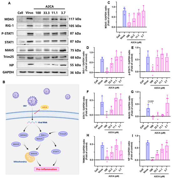 IAV-induced activation of the RIG-I/STAT1 signaling pathway was suppressed after A2CA treatment. (A) Western blot analysis for MDA5, RIG-I, p-STAT1, STAT1, MAVS, TRIM25 and NP in A549 cells. (B) Schematic diagram of A2CA-mediated downregulation of proteins upregulated by IAV. (C–I) The quantitative analysis of the proteins was done using ImageJ. A549 cells were treated with the H1N1 PR/8 strain (MOI = 0.01) and A2CA. At 24 hpi, the total protein was obtained for Western blot analysis. Statistical significance was calculated using one-way ANOVA. * p < 0.05, ** p < 0.01, and **** p < 0.0001.