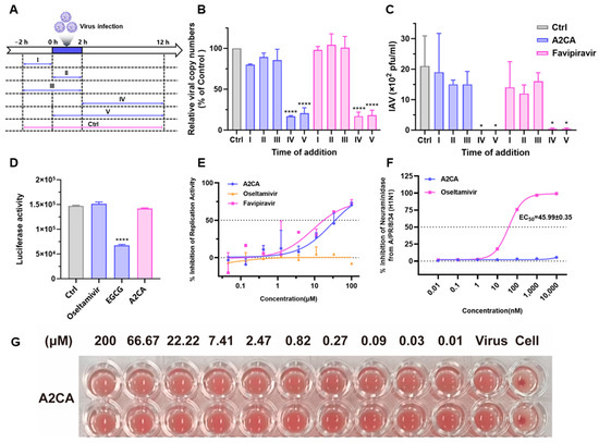 We then try to clarify the mechanism of A2CA. Firstly, a time-of-addition assay was carried out (Figure 6A). The qRT-PCR and PFU assay results suggested that A2CA was only effective in phases IV and V (IAV production and viral RNA replication), which means that it was not an inhibitor of viral attachment and entry (p < 0.0001 or <0.05, Figure 6B,C). Simultaneously, the influenza pseudovirus and replicon assay results also provided similar evidence to validate that A2CA was an influenza virus replication inhibitor like favipiravir (Figure 6D,E). Additionally, neuraminidase inhibition (NI) and hemagglutination inhibition (HI) assays showed that A2CA did not influence neuraminidase activity and the entry of influenza viruses (Figure 6F,G).