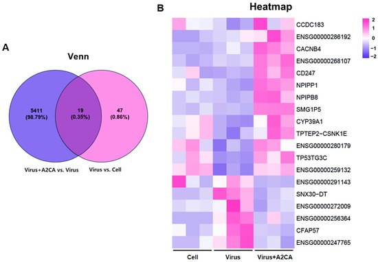 Transcriptome analysis of infected cells after A2CA treatment. DEGs between infected cells with and without A2CA treatment at 18 hpi were obtained by the transcriptome analysis. (A) Venn diagram. (B) Heatmap.