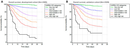 A 30-day post-hospital admission survival stratified by the CARRA-VID prognostic score categories in (A) development and (B) validation cohorts of patients.