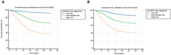 A 30-day post-hospital admission survival stratified by the simplified CARRA-VID (sCARRA-VID) prognostic score categories in (A) development and (B) validation cohorts of patients.