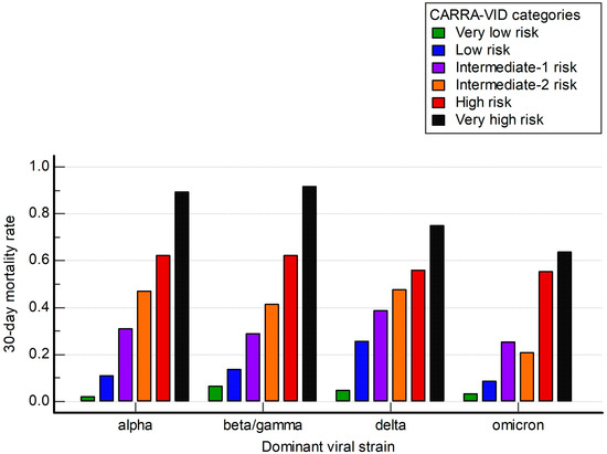 Findings of potent risk stratification using the CARRA-VID prognostic score seem to be stable during different time periods dominated by different viral strains. However, it can be seen that during the time period dominated by the Omicron SARS-CoV-2 viral strain, there seems to be a loss of prognostic discrimination between subgroups of lower, intermediate, and higher risk, respectively, prompting the use of simplified scores.