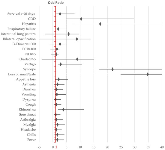 Figure 2. Forest plot illustrating the odds ratios and 95% confidence intervals to identify the differences in COVID-19 characteristics between 2020 and 2024; level of significance p < 0.01, two-tailed.