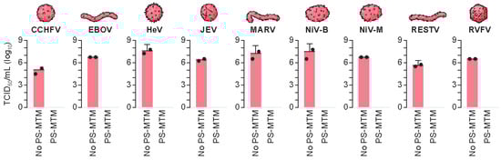 Although PS-MTM has been shown to be active against some viruses, the inactivation of most viruses listed on the National Institute of Allergy and Infectious Diseases (NIAID) Biodefense Pathogen List [18] remains unassessed [8,9,15]. Pandemic threats from high-consequence viruses (e.g., Crimean-Congo hemorrhagic fever virus [CCHFV], Ebola virus [EBOV], Hendra virus [HeV], Japanese encephalitis virus [JeV], Lassa virus [LASV], Marburg virus [MARV], Nipah virus [NiV], Rift Valley fever virus [RVFV], and West Nile virus [WNV]) remain a major concern. These pathogens are often endemic in resource-limited regions, where finite diagnostic, surveillance, cold chain, and containment infrastructure exacerbate their impact [5,19,20]. Coupled with high case-fatality rates, human-to-human transmission, and emerging zoonotic risks, these challenges present significant barriers to effective disease control. This underscores the importance of approaches that increase diagnostic accuracy, biosafety, and biosecurity for high-consequence pathogens, even in resource-limited settings.