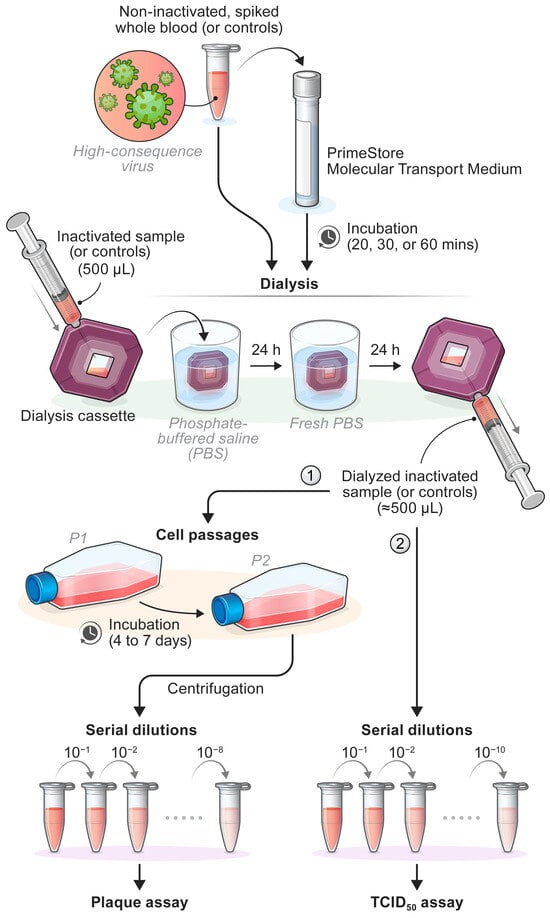 After evaluating potential virus loss during dialysis, inactivated samples, the positive control (non-inactivated spiked whole blood), and PS-MTM alone were dialyzed in PBS to remove residual detergent and minimize cytotoxicity. As described above, each 500 µL sample was dialyzed using Slide-A-Lyzer dialysis cassettes with a molecular weight cutoff of 20 kDa. Dialysis was performed at room temperature for 24 h, followed by PBS replacement and an additional 24 h dialysis. The final volume (≈500 µL) was collected and used to inoculate cells for the validation of chemical inactivation via plaque assay or TCID50 assay (Scheme 1).