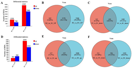 Differential expression analysis of the transcriptome and proteome in the two infection groups. (A) Differentially expressed genes (DEGs) between the two infection groups as compared to the control group. (B) Upregulated and downregulated DEGs shared by the two infection groups. (C) Downregulated DEPs common to both infection groups. (D) Differentially expressed proteins (DEPs) between the two infection groups as compared to the control group. (E) The two infection groups jointly upregulate proteomic DEPs. (F): The two infection groups jointly downregulate proteomic DEPs. Note: R1 represents the control group, R2 represents the 24 h infection group, and R3 represents the 48 h infection group. D1 represents the control group, D2 represents the 24 h infection group, and D3 represents the 48 h infection group. Note: For the comparison of different groups, p-values are those derived from the t-test.