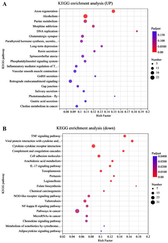 Functional analysis was performed for differentially expressed transcripts by subjecting them to KEGG (with p < 0.05 as the criterion for significant expression (https://www.kegg.jp/kegg, accessed on 24 August 2022)).