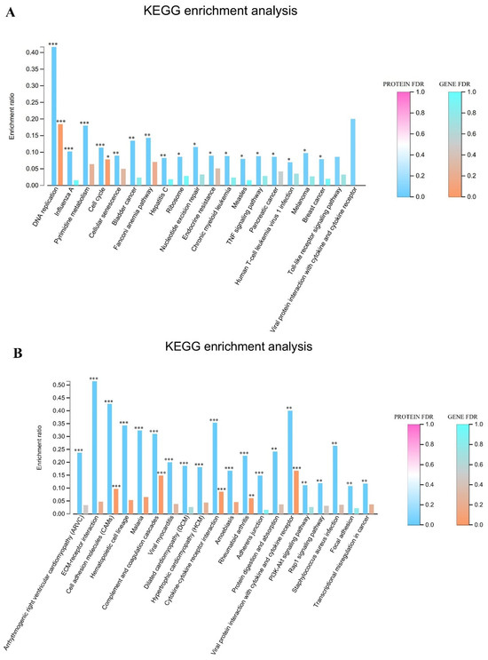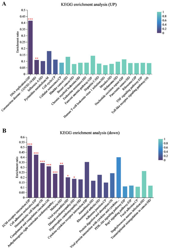 Proteomic KEGG pathways enrichment analysis. (A) Proteomic upregulation KEGG enrichment analysis of the 24 h and 48 h groups together. (B) Proteomic downregulation KEGG enrichment analysis of the 24 h and 48 h groups together. Note: for the comparison of different groups, p-values are those derived from the t-test, and “*” indicates significant differences (p < 0.05), “**” indicates significant differences (p < 0.01), “***” indicates highly significant (p < 0.001).