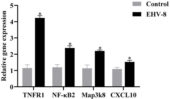 RT-PCR results for 48 h infected groups. Note: for the comparison of different groups, p-values are those derived from the t-test, and “*” indicates significant differences (p < 0.05).