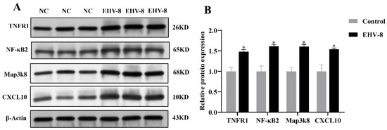 Graph of Western blot results of differential proteins in 48 h infection group. (A) WB results. (B) Relative expression map of differential proteins. Note: for the comparison of different groups, p-values are those derived from the t-test, and “*” indicates significant differences (p < 0.05).