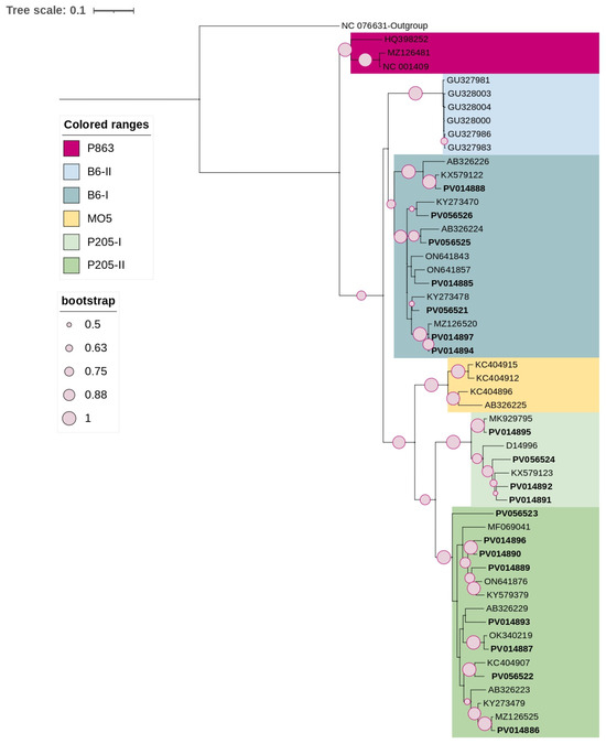 The ML phylogenetic tree of ACLSV (Figure 1) was constructed using 32 reference sequences representing different molecular groups (P863, B6-I, B6-II, MO5, P205-I, P205-II) as previously described by Zuļģe and her co-authors [27].