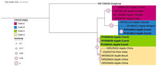 Three ARWV1 ML phylogenetic trees were constructed based on the complete coding region of replicase (Figure S10), movement (Figure S11), and coat proteins (Figure 3). The topology of the movement protein tree was largely similar to that observed for the replicase coding region, revealing four distinct clades. The five Czech ARWV1 isolates, subjects of this study, formed a distinct clade (clade C). In contrast, the ML phylogenetic tree constructed based on the coat protein coding region (Figure 3) showed a different topology, with the Czech isolates no longer clustering together. Two isolates (PV014913 and PV014914), both detected in mixed infections, clustered within clade B with isolates from Canada and Belgium. The remaining three Czech isolates (PV056530, PV056541, and PV056543), identified in single infections, remained within clade C.