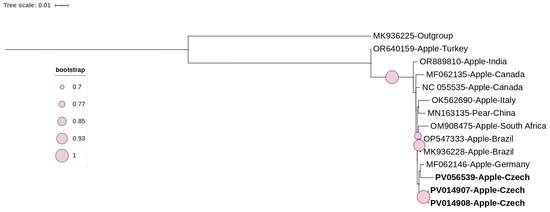 Similarly, the RNA2 tree showed host-specific separation but with a different topology for the Czech isolates (Figure 6). Isolate (CCGaV-S1, PV056536) clustered separately near the outgroup, while isolate (PV05653, CCGaV-S4) grouped with other apple isolates.