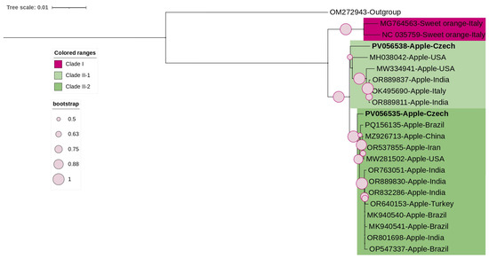 ML-phylogenetic tree constructed using the best-fitted method (K2 + G + I) and based on the complete CP coding region of 53 ACLSV isolates, including 19 Czech isolates (highlighted in bold). PCLSV (NC076631) was used as an outgroup. The tree was viewed using iTOLv7.