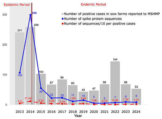 The gray bars represent the number of positive cases in sow farms per year reported to MSHMP. The solid blue line represents the number of spike protein sequences available. The dashed red line represents the number of sequences per 10 sow farms reporting outbreaks. The brown line marks the boundary between the epidemic and endemic periods.