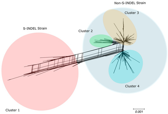 Bifurcating phylogenetic trees are not always capable of capturing the evolutionary history of organisms, especially those that experience frequent recombination events [49]. To assess the impact of recombination events in shaping the genealogical trajectory of complete PEDV genomes, we reconstructed phylogenetic networks using SplitsTree4 [49] to capture the non-tree-like evolutionary patterns, which could potentially be explained by evidence of recombination events. Based on the topology of the phylogenetic networks, the PEDV full genome were grouped into four clusters (Figure 2): the cluster that includes the S-INDEL strain shows a long branch, reflecting the high divergence between these S-INDEL and non-S-INDEL sequences, and three other genetically more similar clusters comprising sequences of the PEDV non-S-INDEL strain (Figure 2). The lateral edges (reticulations) connecting the branches of the phylogenetic network provide evidence of lateral transfer of genetic material between clusters (Figure 2). Additionally, we performed the PHI test, which detected significant evidence of recombination events among the PEDV full genome sequences (p < 0.001).