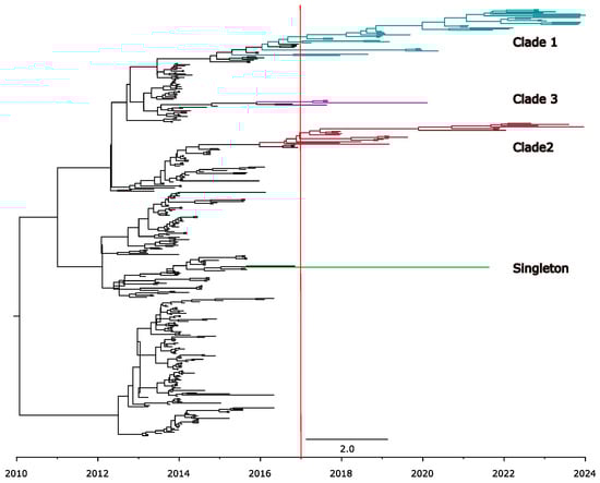Time-scaled tree of PEDV spike protein sequences from PEDV non-S-INDEL strains. The scale at the bottom of the tree represents the time-scale in years. The earlier clades from the epidemic-period are colored in black, while the clades currently circulating in the U.S. are highlighted in different colors: clade 1 in blue, clade 2 in red, clade 3 in pink, and singleton 1 in green. The red line indicates the year 2017, marking the point when the composition of the PEDV non-indel strain population changes, and several ancestral clades have not been detected since.
