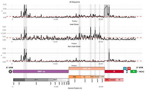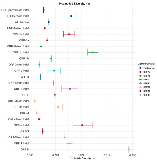 Genetic variability was assessed for the complete set of sequences and for each strain individually. Nucleotide diversity was estimated for complete genomes. We also estimated the genetic diversity for each individual coding regions to evaluate the relative contribution of the genetic diversity of each gene to the diversity observed in the complete genome (Figure 6). When analyzing the complete dataset (S-INDEL and non-S-INDEL combined), we found that the Spike (S) protein exhibited the highest nucleotide diversity by far (0.015), followed by the Envelope (E) (0.0038), ORF1b (0.0033), ORF1a (0.0026), Nucleocapsid (N) (0.0019), ORF3 (0.0016), and finally, the Matrix (M) protein (0.0010). All showed substantial differences in their mean π values (Figure 6).
