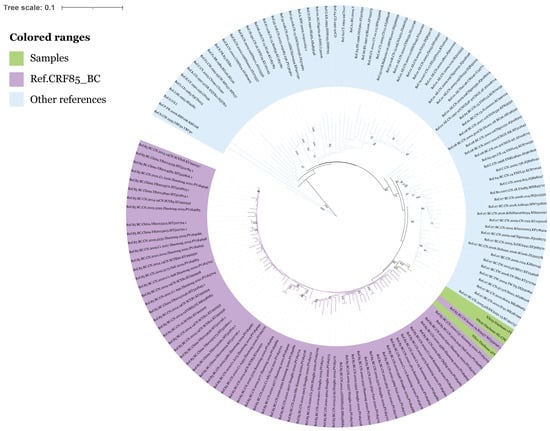 The obtained and sorted sequences were uploaded to the HIV databases website using the HIV BLAST online tool (https://blast.ncbi.nlm.nih.gov/Blast.cgi (accessed on 26 April 2025)). The HIV-1 subtypes were subjected to preliminary analysis, and MEGA11 software was employed to construct the neighbor-joining phylogenetic tree (bootstrap value = 100%, Tamura Nei model was utilized) for synchronous confirmation.