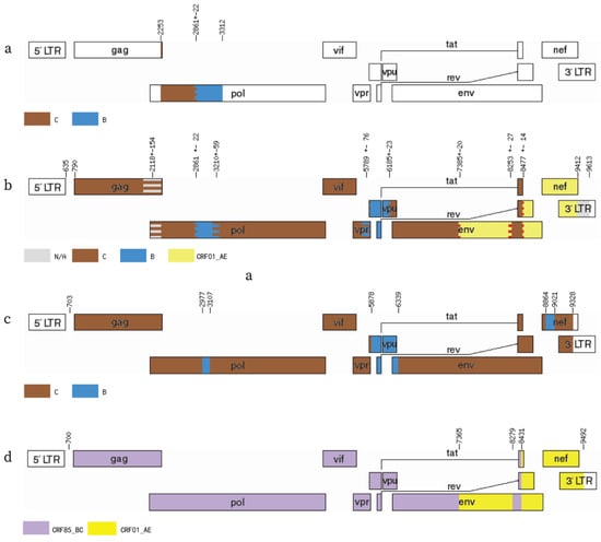 - Su, L.; Wei, D.; Yang, H.; Zeng, Y.; Hu, Y.; Yuan, D.; Feng, L.; Ruan, Y.; Qin, G.; Liang, S. Identification of a Novel HIV-1 Circulating Recombinant Form (CRF85_BC) in Sichuan, China. AIDS Res. Hum. Retroviruses 2016, 32, 895–899. [Google Scholar] [CrossRef] [PubMed]