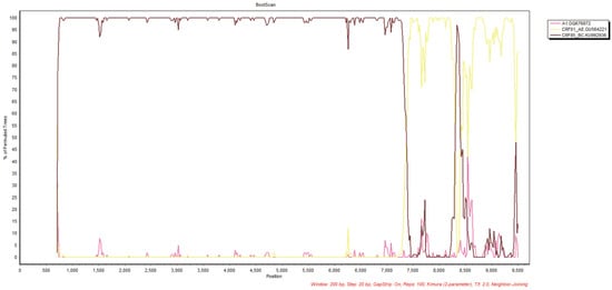 Currently, the reference sequence libraries of jpHMM online tools only encompass the A-L and CRF01_AE subtypes, and B/C recombinations are not yet included. Consequently, the Simplot3.5.1 software was employed to examine the genetic similarity between NX01 NFLG and the standard reference strains of diverse subtypes, in order to identify the locations of their recombination breakpoints. The results demonstrated that NX01 is a novel second-generation recombinant strain formed by CRF01_AE and CRF85_BC. The gene recombination pattern of this sequence was characterized by the insertion of two CRF01_AE fragments into genomic backbone of the CRF85_BC subtype. Furthermore, BootScan mapping revealed that the insertion recombination site was located at the env region of the 7365~8279 locus, with a second site at 8431~9492 (Figure 2d and Figure 3).