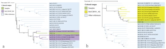Analysis of the phylogenetic tree of sample NX01 subgenotypes. (a) Phylogenetic tree analysis of the first subgenotype fragment (6660 bp) of NX01; (b) phylogenetic tree analysis of the fourth subgenotype fragment (1260 bp) of NX01. Color Notes: Samples (green), other references (blue), CRF85_BC (purple).