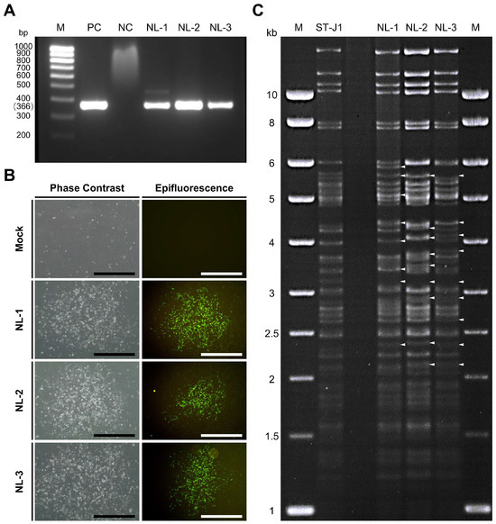 Three pooled organ samples from diseased fish initially suspected of being infected with CyHV-2 were generously provided by WBVR (Wageningen Bioveterinary Research), part of Wageningen University in The Netherlands. We assigned them the names NL-1, NL-2, and NL-3 (see Section 2 for details). Upon arrival in our lab, these samples were screened for the presence of CyHV-2 using a PCR assay targeting the CyHV-2 helicase gene. Through this process, we confirmed the presence of the virus, with the expected 366 bp PCR product forming in all three samples (Figure 1A).