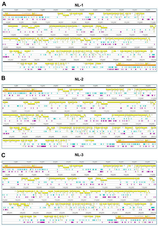 Schematic of (A) NL-1, (B) NL-2, and (C) NL-3 assembled genomes. Direct terminal repeats are indicated in orange. ORFs with 99% sequence match to ORFs in CyHV-2 ST-J1 reference genome (NC_019495.1) are indicated in yellow and labelled by their corresponding ORF number in the reference genome. Substitutions involving more than one nucleotide, insertions, or deletions are highlighted in turquoise. SNVs are indicated in purple. The locations of all variants are based on their starting point in each of their respective genomes, with feature lengths enlarged to ensure visualization on the map (coordinates correspond to the data in Tables S1–S3).