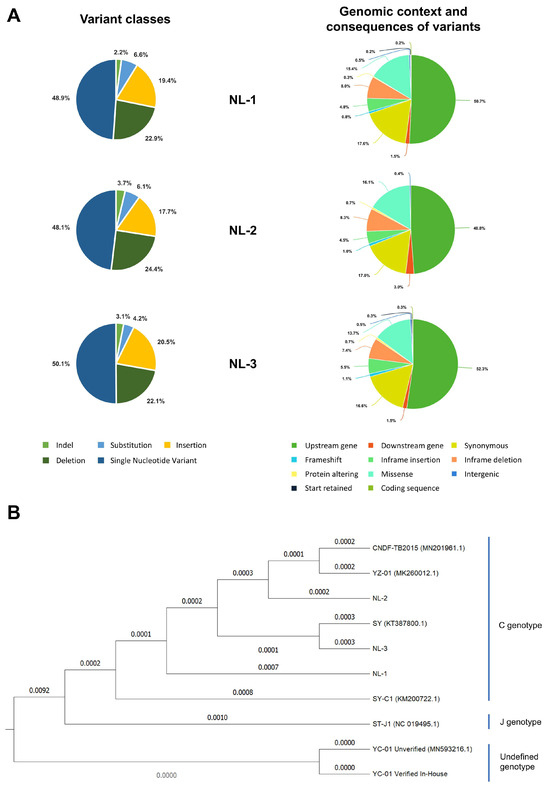 To determine the exact nature of the differences, viral DNA prepared from purified particles of each NL-1, NL-2, and NL-3 were also subject to genomic sequencing. As part of this process, three independent plaque-purified sub-cultures (or replicates) were sequenced from each isolate. Genome assembly revealed little or no differences between the plaque-purified sub-cultures of individual isolates. For each isolate, the sequences of the three purified sub-cultures were used to generate a single representative consensus genome sequence, which was used in further analysis. The representative genome sequences for the NL-1, NL-2, and NL-3 isolates are available on GenBank under the accession numbers PQ738159.1, PQ723683.1, and PQ738160.1, respectively. The results of genome sequencing were in agreement with the RFLP analysis, indicating that each isolate exhibited many differences (each exhibiting > 600 differences) relative to the ST-J1 reference strain. These are presented in Figure 2, described in detail in Tables S1–S6, and summarized in Table 1. Some of these differences to the reference strain included major changes, such as frameshifts in several ORFs of unknown function; however, as expected, most of the changes consisted of single nucleotide variants (SNVs) (Figure 3A left and Table 1) and either occurred outside of protein coding regions or were synonymous mutations, therefore having no impact on the amino acid sequence (Figure 3A Right).