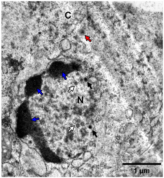 Transmission electron microscopy of the CyHV-2 NL-2 isolate. This image represents the ultrastructure of CyHV-2-infected kidney cells. Nuclear chromatin margination consistent with herpesvirus infection is visible (blue arrows). Virus particles at different stages of assembly are also visible, including some prime examples of incomplete nuclear particles with empty or partially complete cores (white arrows) and capsids with a central electron-dense core (black arrows). Cytoplasmic virions, which appear to be larger than nuclear viral particles and thus potentially organelle-enveloped as part of the process of egress from the cell, are also visible (red arrows). N = nucleus; C = cytoplasm.