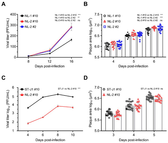 Comparison of in vitro growth kinetics and plaque sizes between the NL-1 and NL-2 isolates. (A) Viral growth curve comparison between NL-1 #10, NL-2 #10, and NL-2 #2. RyuF-2 cells were infected with the indicated strains (MOI = 0.0001), and the log10 value of the titer (PFU/mL) in the supernatant was determined at 8, 12, and 16 dpi. Data represent the mean ± SEM of triplicate measurements. (B) Viral plaque size comparison between NL-1 #10, NL-2 #10, and NL-2 #2. RyuF-2 cells were infected with the respective strains, and plaque areas were measured at 4, 5, and 6 dpi. Data represent the mean ± SEM of 20 individual plaques. (C) Viral growth curve comparison between ST-J1 and NL-2. RyuF-2 cells were infected with the indicated strains (MOI = 0.01), and the log10 value of the titer (PFU/mL) in the supernatant was determined at 4, 6, 8, and 10 dpi. Data represent the mean ± SEM of triplicate measurements. (D) Viral plaque size comparison in ST-J1 and NL-2. RyuF-2 cells were infected with the respective strains, and plaque areas were measured at 3, 4, and 5 dpi. Data represent the mean ± SEM of 20 individual plaques.