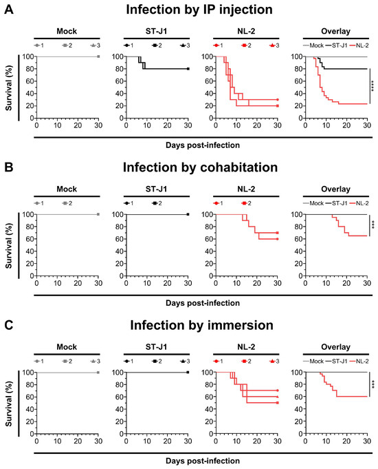 Comparison of NL-2 and ST-J1 in young adult Shubunkin goldfish in vivo. The pathogenicity of the two strains (both at passage #10) was tested in young adult Shubunkin goldfish (average weight 5.84 ± 0.6 g). (A) Comparison of in vivo pathogenicity of the ST-J1 and NL-2 strains after infection by IP injection. Fish were mock-infected or infected by IP injection (triplicate groups each consisting of 10 subjects) with the indicated strains. Each subject received a 50 µL injection of inoculum (1000 PFU/fish). The fish were monitored daily for clinical signs of CyHV-2 disease, and fish reaching the endpoints were euthanized. In the overlay graph, the mean survival results were compared. (B) Comparison of in vivo pathogenicity of the ST-J1 and NL-2 strains after infection by cohabitation. The same number of goldfish were placed as sentinel fish in the first two replicates of each group in the experiment described in (A) (5 days after infection by IP injection). Fish were examined daily, and those reaching the endpoints were euthanized. In the overlay graph, the mean survival results were compared. (C) Comparison of in vivo pathogenicity of the ST-J1 and NL-2 strains following infection by immersion. Fish were mock-infected or infected by immersion in water containing each virus strain at a final concentration of 2000 PFU/mL (triplicate groups each consisting of 10 subjects). Fish were examined daily, and those reaching the endpoints were euthanized. In the overlay graph, the mean survival results were compared.