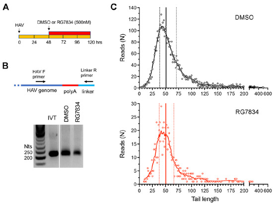 HAV 3′ poly(A) tail length distribution in infected Huh-7.5 cells. (A) Experimental scheme showing RG7834 (500 nM) or vehicle-only (DMSO) treatment of cells between 48 and 120 h after infection. (B) 3′RACE assay for HAV genomic RNA. IVT, in vitro transcribed RNA. (C) 3′ poly(A) tail lengths determined by nanopore sequencing. Data shown represent combined results from two independent experiments. The total numbers of HAV reads were 5106 for control cells and 909 for RG7834-treated cells. Vertical lines indicate quartiles: DMSO control cell median = 51 nts, RG7834-treated cells = 52 nts.