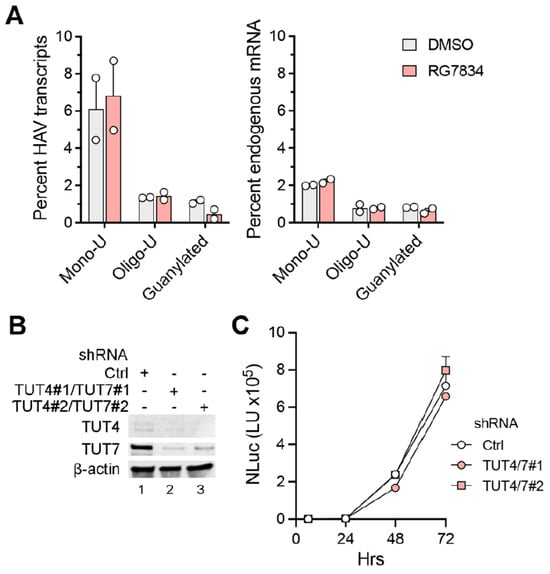 Additionally, we carried out nanopore long-read sequencing of RNAs from HAV-infected Huh-7.5 cells. This allowed us to capture the length of the poly(A) tail in each individual viral RNA. These results revealed a wide range of poly(A) tail lengths in HAV RNAs (Figure 2C, top), with the most abundant, modal length being ~42 nts and the median length being 51 nts. Despite a sharp decline in HAV RNA abundance, there was no change in the distribution of poly(A) tail lengths in RG7834-treated cells (Figure 2C, bottom). These results thus confirm that TENT4 does not regulate the length of the HAV 3′ poly(A) tail. Interestingly, the nanopore sequencing data revealed a small fraction (6–7%) of viral RNAs possess 3′ tails that are terminally mono- or oligo-uridylated (Figure 3A, left). Such 3′ uridylation is a signature of the cellular terminal uridyltransferases TUT4 and TUT7, which are not inhibited by RG7834, and it generally marks the RNA for degradation [30]. Interestingly, the proportion of HAV RNAs that were uridylated was substantially greater than the proportion of endogenous host cell mRNAs in these experiments (p < 0.05 by two-way ANOVA) (Figure 3A, right). Uridylation of poly(A) tails typically promotes RNA degradation, but shRNA knockdown of TUT4 and TUT7 had no apparent effect on 18f-NLuc virus replication in Huh-7.5 cells (Figure 3B,C). A smaller fraction of the viral RNAs (about 1%) were guanylated at the 3′ terminal or penultimate base, a signature of TENT4 known as “mixed tailing”, which acts to shield the RNA from deadenylation and degradation [31]. The percentage of guanylated viral tails was reduced in RG7834-treated cells, but this difference did not reach statistical significance.