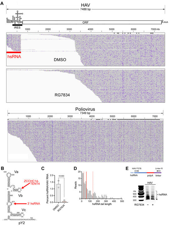 Subgenomic hsRNAs are expressed in HAV-infected Huh-7.5 cells. (A) (top) Alignment plot of long-read nanopore sequences of HAV RNA isolated from RG7834 and DMSO-treated Huh-7.5 cells. 3′ poly-adenylated subgenomic hsRNAs (red band) align with the 5′ untranslated RNA (5′UTR) segment of the genome in cells treated with the DMSO vehicle. hsRNAs are not detected among RNAs isolated from cells treated with the TENT4 inhibitor RG7834. hsRNAs are 5′ co-terminal with the genome and overlap the internal ribosome entry site (IRES, black band). (bottom) Similar nanopore sequencing of poliovirus-infected cells. (B) Predicted secondary RNA structure of domain V within the 5′ UTR [32], showing stem-loops Va, Vb (to which ZCCHC14 is recruited) [4], and Vc, and the position at which hsRNAs terminate, nts 672–3 (numbering is for wildtype HM175 virus, GenBank M14707.1). pY2, second pyrimidine-rich track. (C) hsRNA abundance relative to HAV RNA transcripts in two independent experiments. HAV reads in DMSO control cells ranged from 3266 to 3701, and those in RG7834-treated cells ranged from 611 to 639. p-values < 0.003 by X2 contingency test in both experiments. (D) hsRNA 3′ poly(A) tail length. Vertical lines represent quartiles; median = 58 nts. (E) 3′RACE assay for hsRNA. Treatment scheme is the same as in Figure 2A. * Nonspecific mitochondrial RNA.
